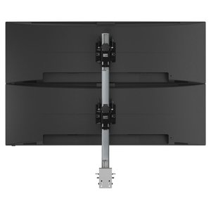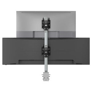 AWMS-2-BT75-H-S is a super heavy duty mount with desk clamp for two ultrawide displays in a vertical stack configuration. It has a silver finish with black brackets.