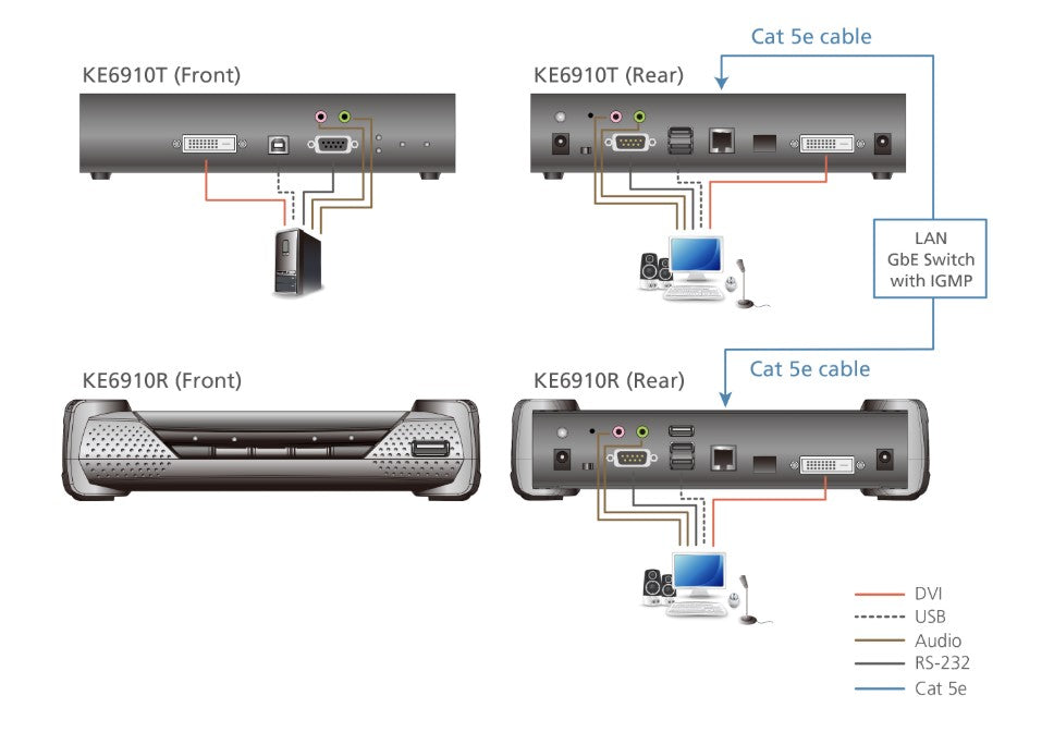 The KE6910 2K DVI-D Dual Link KVM over IP Extender consists of a high performance IP-based transmitter (KE6910T) that connects to the computer and receiver (KE6910R) that provides console access from a separate location. The KE6910 allows access to a computer system from a remote USB console (USB keyboard, USB mouse, DVI monitor) over an intranet, enabling users to locate computers in a secure and temperature controlled environment, which is isolated from users’ workstation.