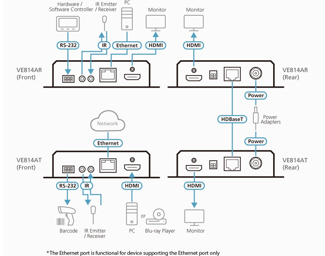 ATEN VE814A is an HDBaseT Video Extender that is capable of sending HDMI signals up to 100 m over a single Cat 5e/6/6a or ATEN 2L-2910 Cat 6 cable. Featuring dual synchronous outputs, the VE814A can transmit video signal to two remote displays and one at the local side. This HDCP 2.2-compliant extender meets the HDMI Specification, including 3D, Deep Color, the maximum data rate of (10.2 Gbps), and 4K video quality up to 100 m.