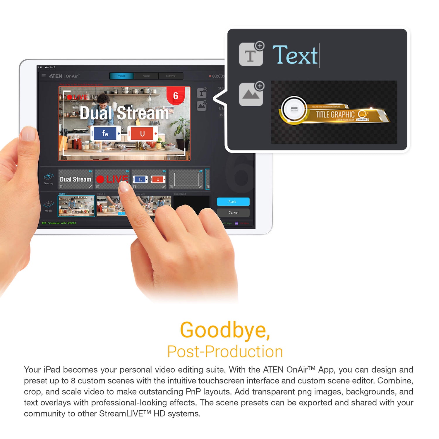 Intuitive app for preview and program monitoring, change video layout in Full Screen/PBP/PIP settings, adding image and subtitles overlays, and smooth scenes transitions for a professional finish