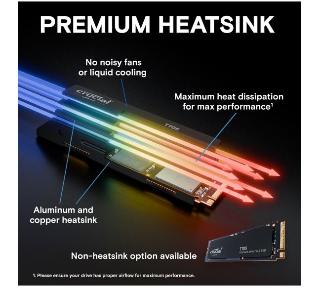 Micron (Crucial) Crucial T705 2TB Gen5 NVMe SSD Heatsink - 14500/12700 MB/s R/W 1200TBW 1550K IOPs 1.5M hrs MTTF DirectStorage for Intel 14th Gen & AMD Ryzen 7000